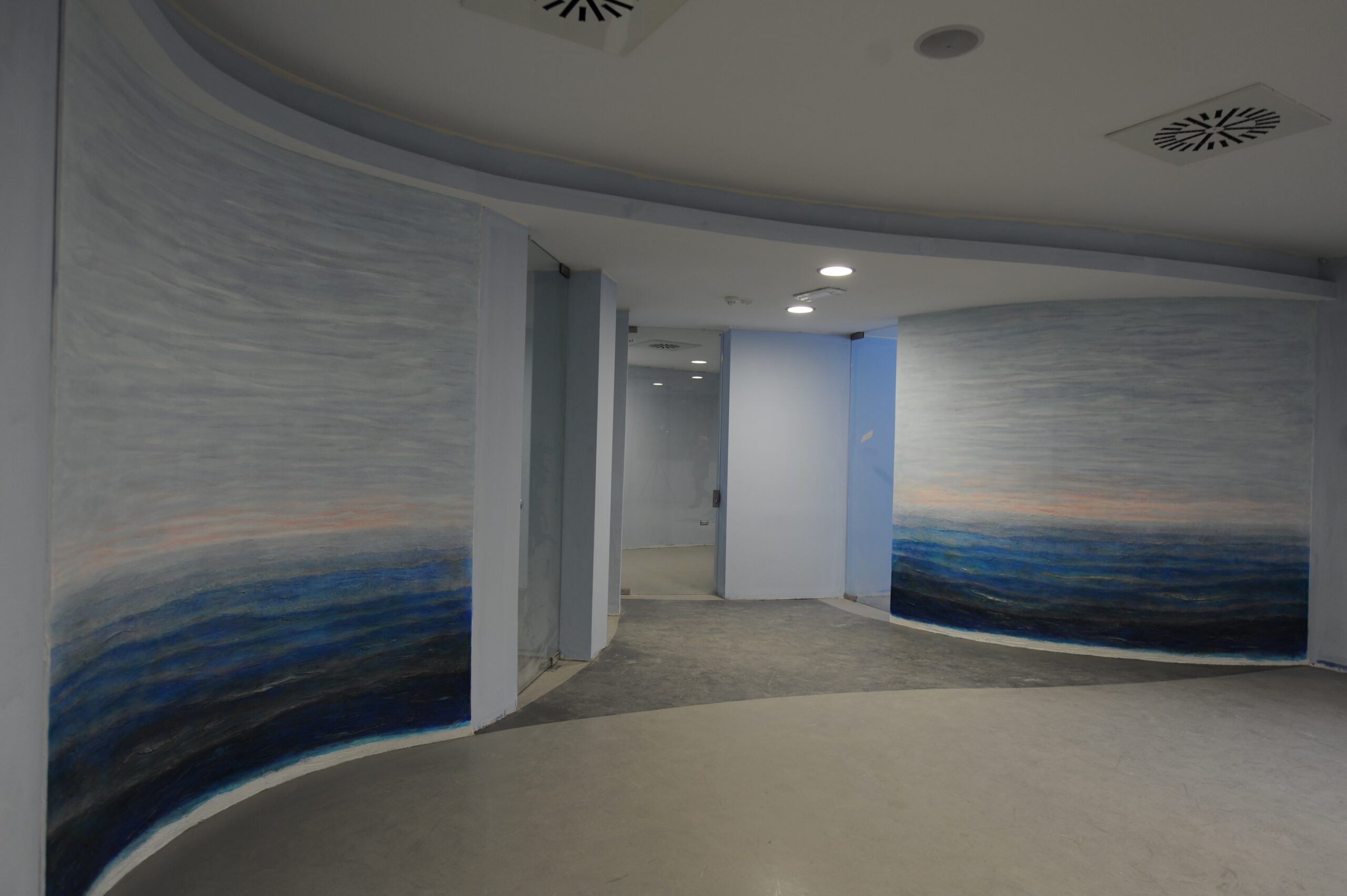 Le pareti concave e convesse accolgono lo sguardo in un abbraccio cromatico che unisce cielo e terra, pittura e spirito, materia e luce.